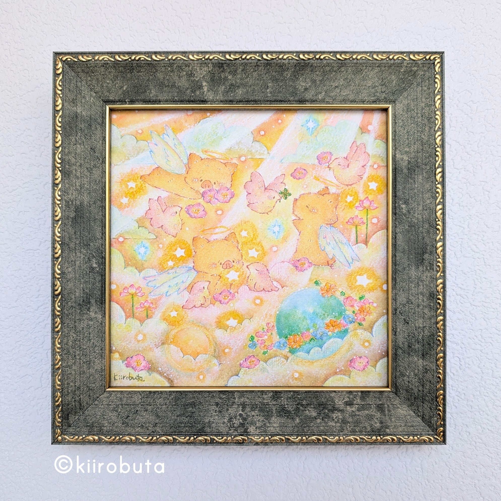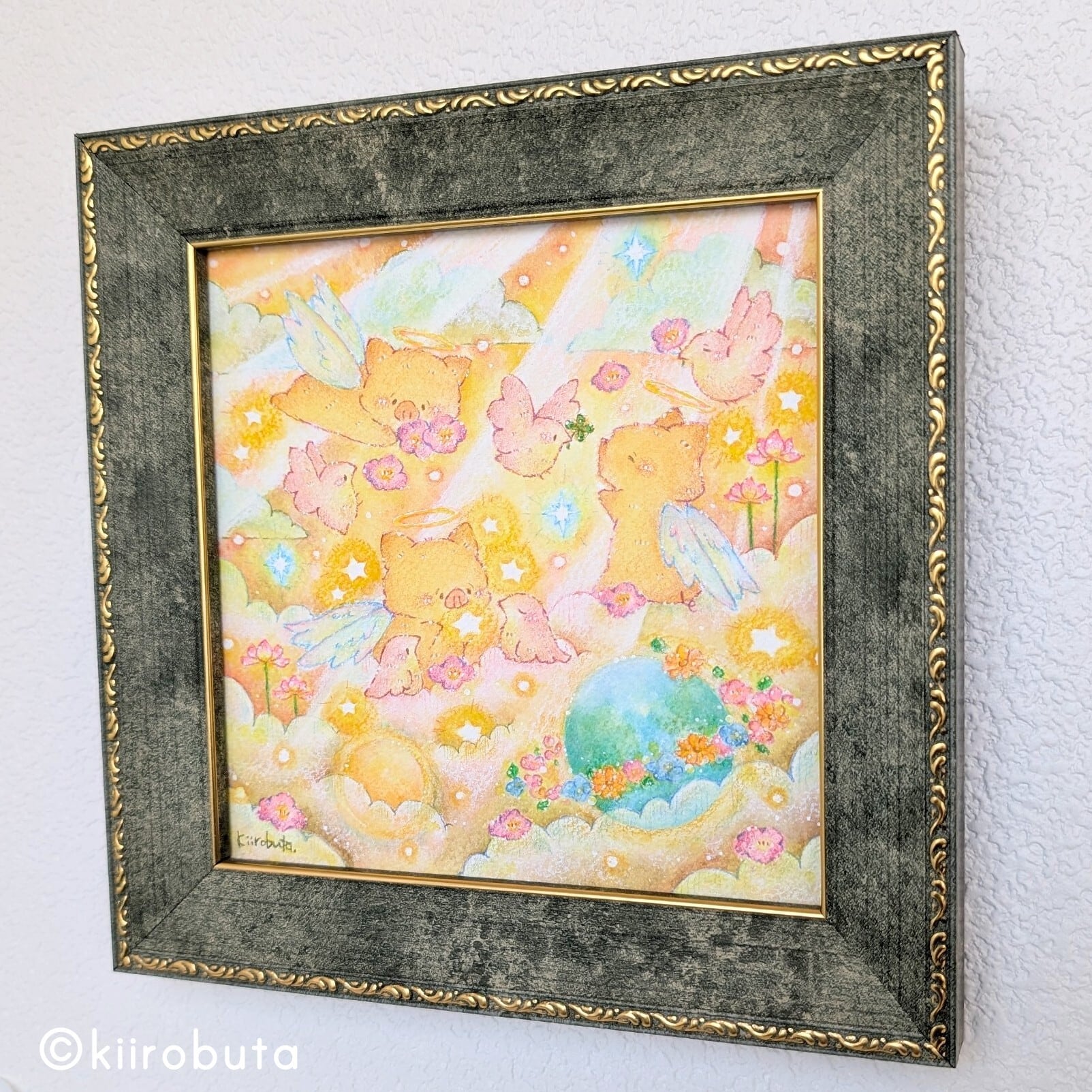 作品は額縁専門店で購入した専用の『かぶせ箱』に入れてお届けします。箱には購入時の管理用シールが貼られておりますが保護と保管のためにそのまま使用しております。ご了承ください。